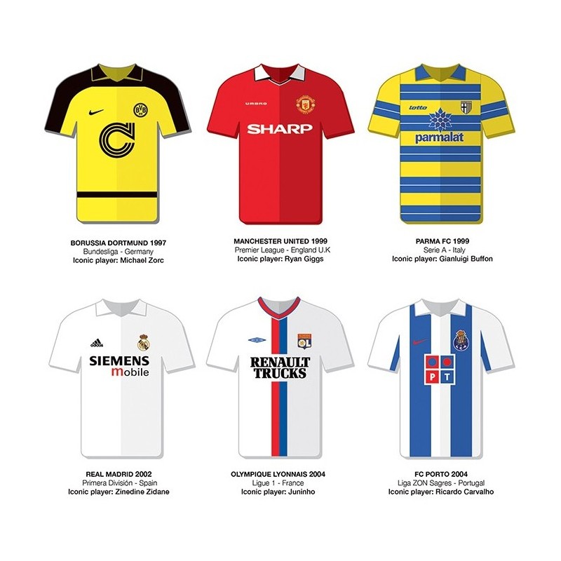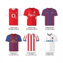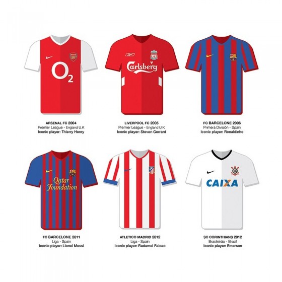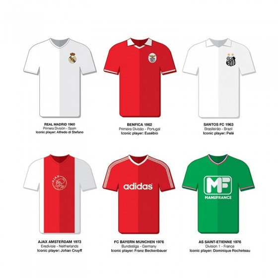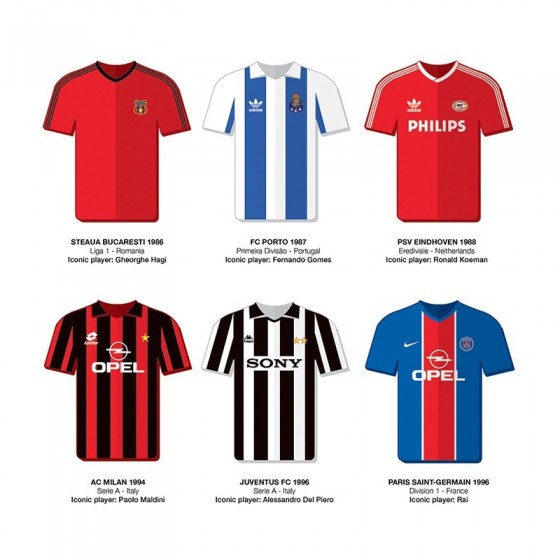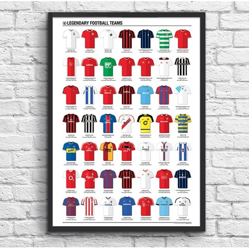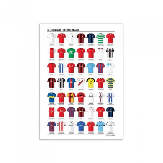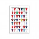 Retrouvez les équipes mythiques qui ont marquées l'histoire de ce sport. Du Milan AC de Marco Van Basten au FC Barcelone de Messi, le Real Madrid de Ronaldo ou encore l'OM de Deschamps. Retrouvez les maillots cultes de ces équipes alignés sur une même affiche.